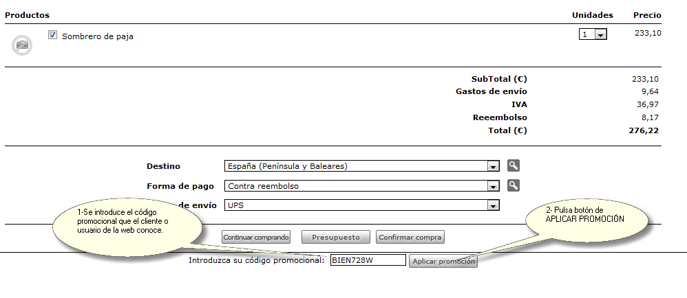 se mostrará por pantalla al hacer el pedido y en la confirmación del