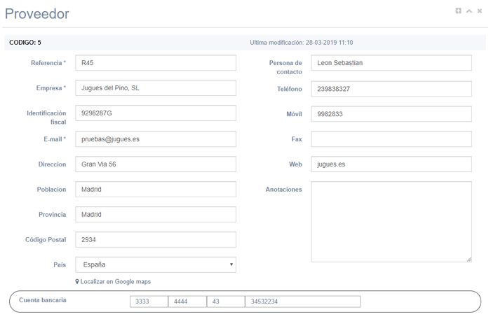 Introduce todos los datos de la ficha del proveedor o al menos los indicados como obligatorios. Te será útil para relacionarlo con tus productos
